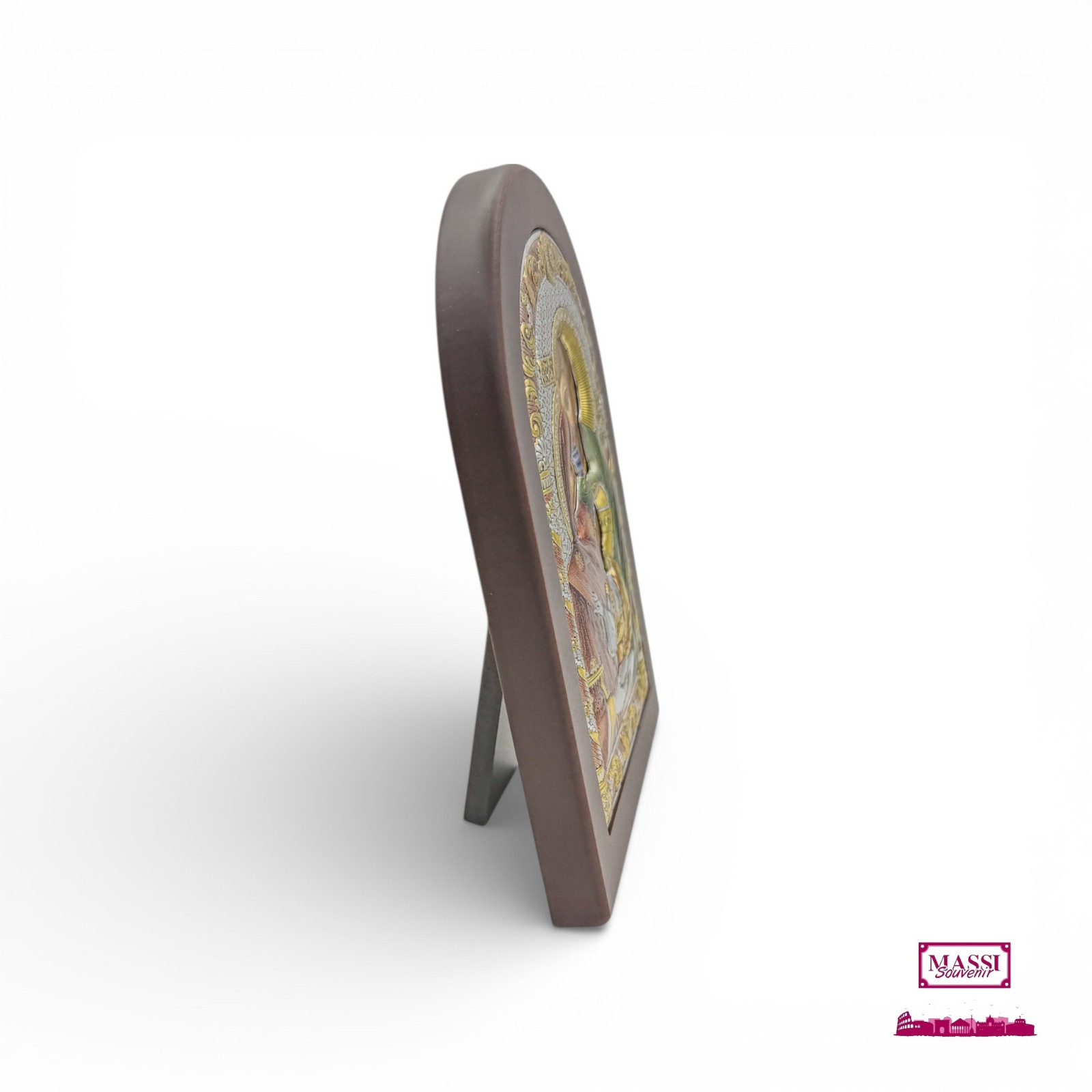 Preziosa icona da tavolo raffigurante la Sacra Famiglia. Realizzata con una lastra in Argento 925 lavorata a rilievo e finemente colorata, applicata su una base in legno scuro a forma di arco.