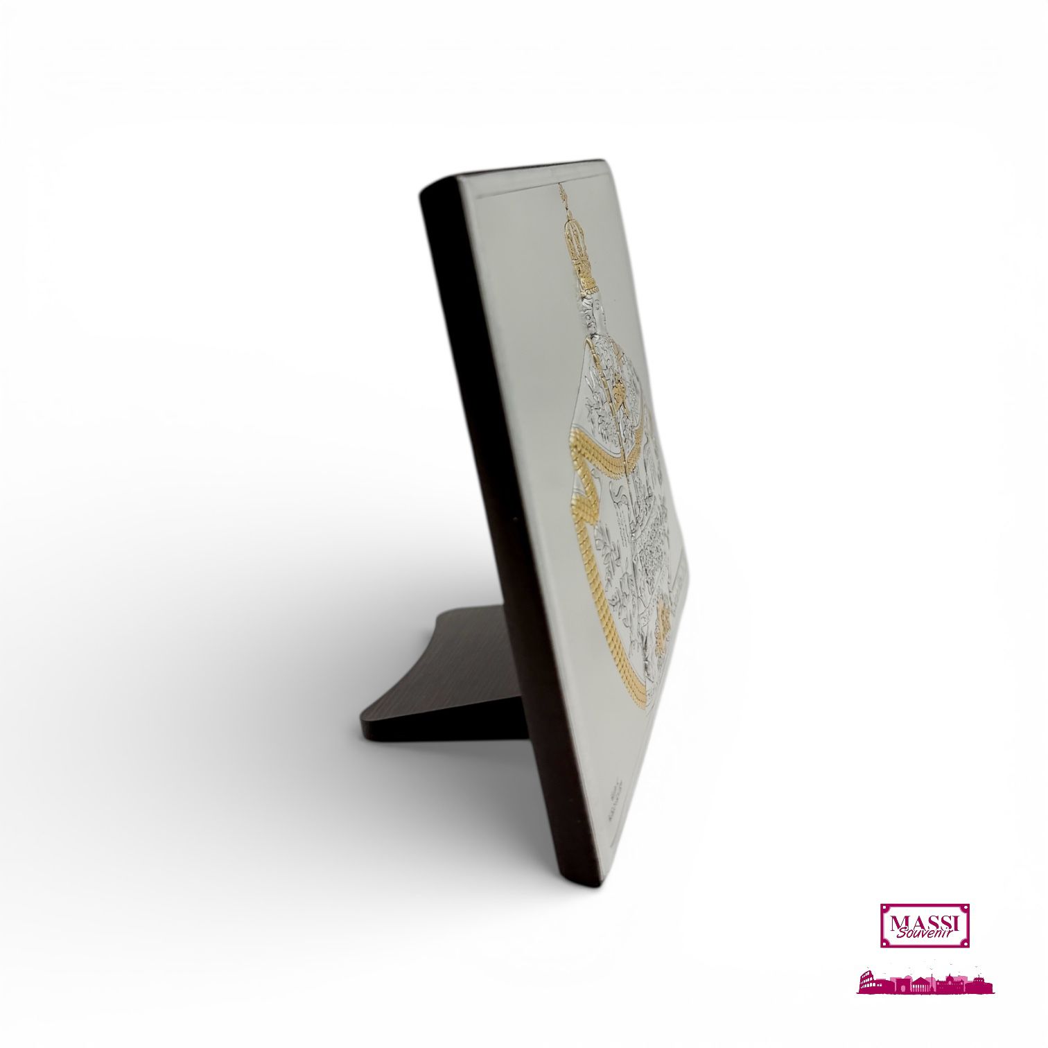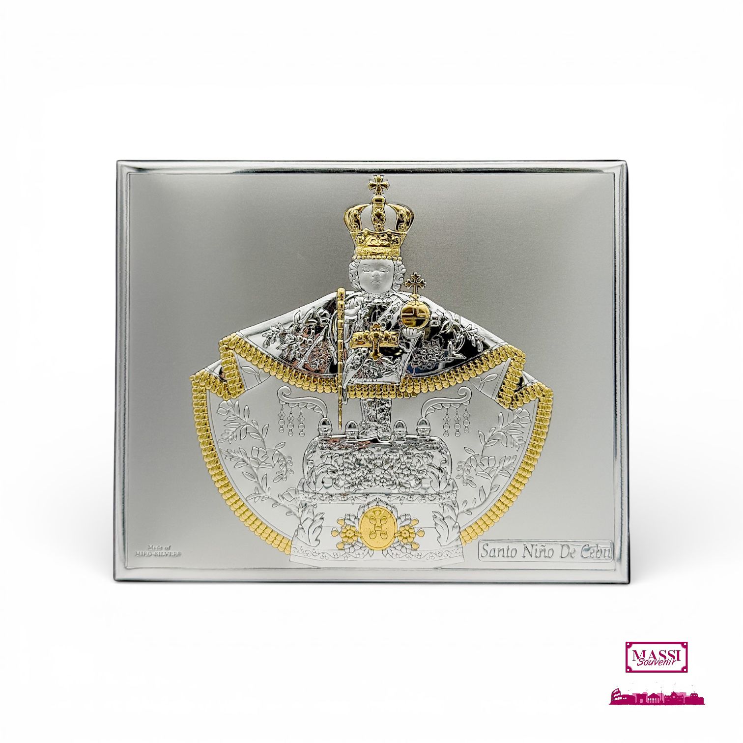 Elegante icona sacra da appoggio raffigurante il Santo Niño de Cebu (il Bambino Gesù di Cebu). Realizzata con l’innovativa tecnologia Miro Silver, la placca offre una brillantezza eccezionale, arricchita da dettagli in oro che risaltano sulla veste e sulla corona. Il retro in legno scuro garantisce stabilità e pregio. L’immagine a rilievo mostra il Santo Bambino con le sue insegne regali: la corona, lo scettro e il globo crucigero. La lavorazione è impreziosita da dettagli placcati in oro che decorano minuziosamente i ricami del mantello, i gioielli e la base. Questo contrasto tra argento e oro dona profondità e luce alla figura sacra.
