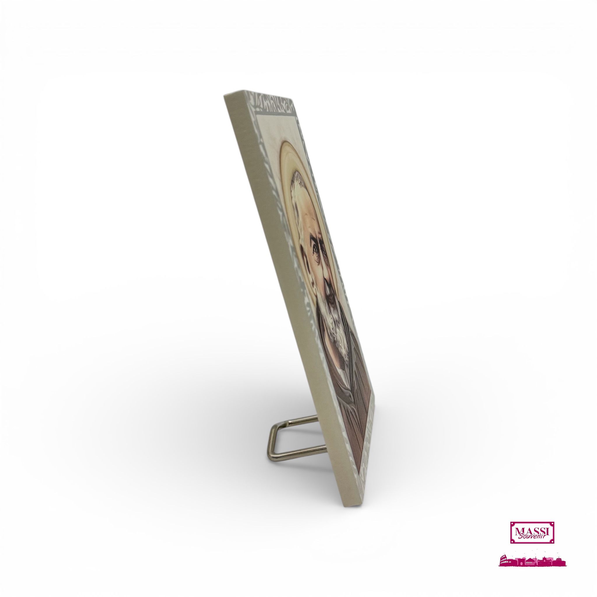 1. Da Tavolo: Grazie al piedino in metallo (incluso e rimovibile), può essere esposta su qualsiasi superficie piana, ideale per il comodino o l’angolo preghiera.