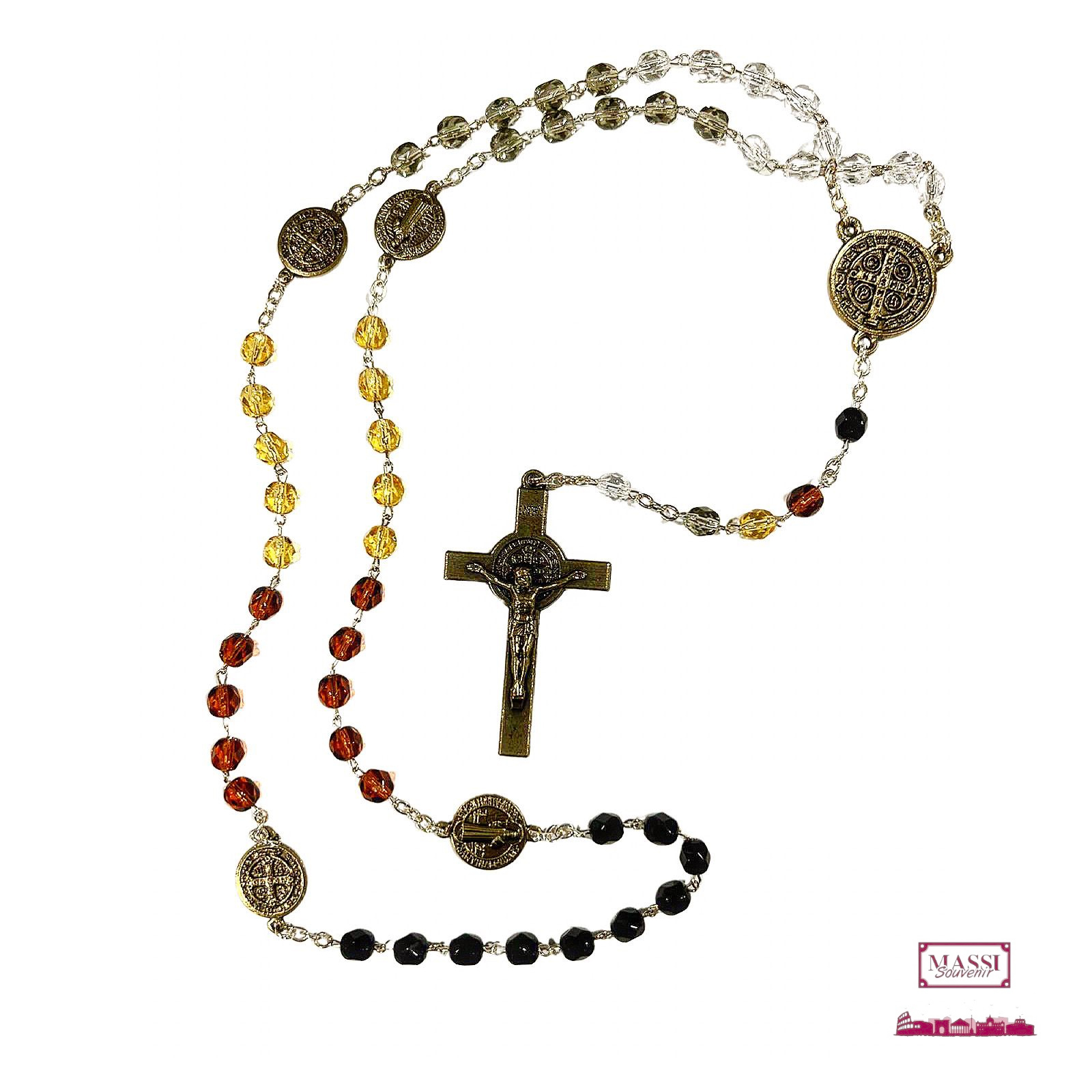 Rosario dedicato a San Benedetto, realizzato con grani multicolore ⌀6mm (nero, ambra, giallo e verde), simbolo di fede e protezione. Ogni decina è separata da medaglie di San Benedetto, noto per la sua forza spirituale contro il male. Il rosario termina con un crocifisso in metallo finemente lavorato, arricchito dalla medaglia di San Benedetto al centro.