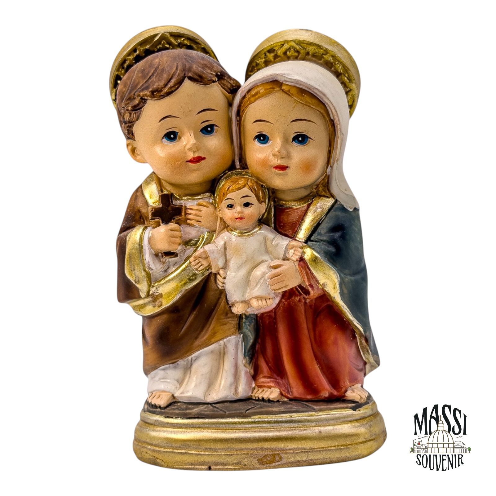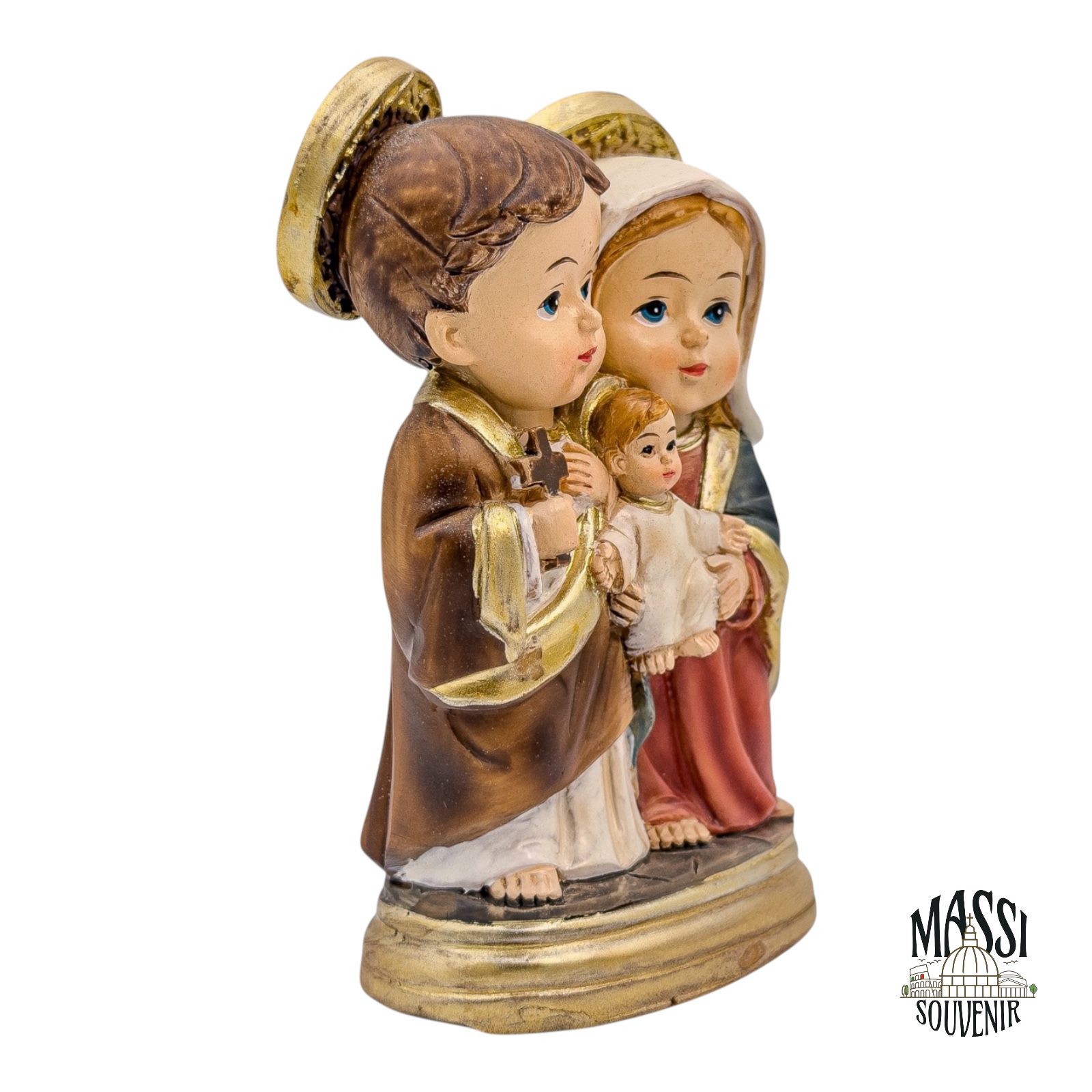 • Le Finiture: I colori classici delle vesti sono esaltati da ricche spennellate dorate che incorniciano i manti, illuminano le aureole e rivestono interamente la base d’appoggio, conferendo grande luminosità e pregio all’oggetto.