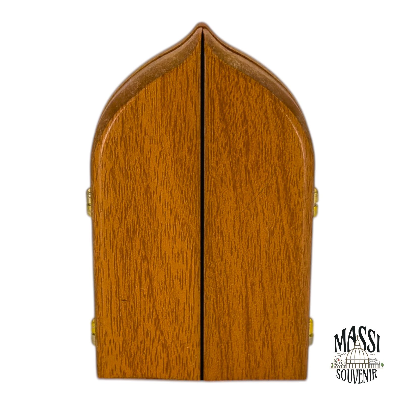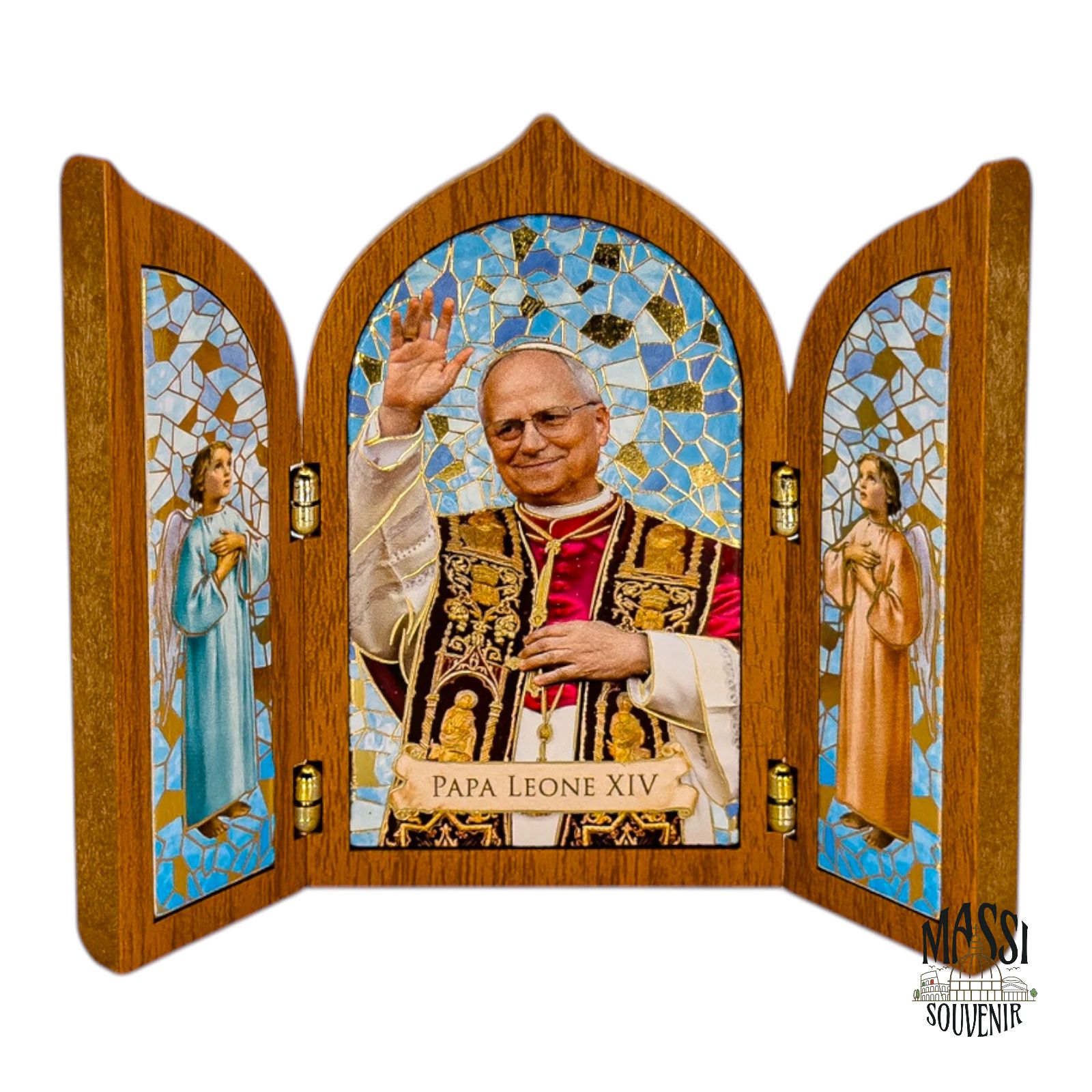 Elegante quadretto a trittico da appoggio dedicato a Papa Leone XIV. Realizzato in robusto PVC con finitura effetto legno, presenta l’immagine centrale del Santo Padre benedicente, affiancato da due angeli in preghiera sulle ante laterali. Le figure sono incorniciate da un suggestivo sfondo effetto mosaico dai luminosi toni dell’azzurro e dell’oro. I pannelli sono uniti da cerniere in metallo dorato che permettono di esporlo aperto su qualsiasi superficie o di richiuderlo facilmente.